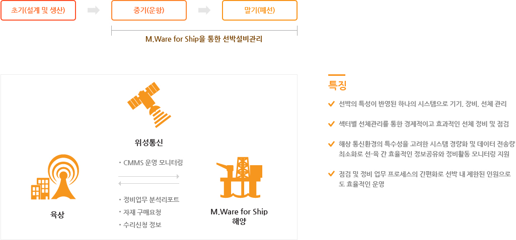 경제적인 선박운영을 가능하게 합니다. M.Ware for Ship를 통해 FPSO(Floating Production Storage & Offloading), Rig선과 같은 고부가 가치 선박 및 해양플랜트의 운영단계에서의 유지보수 비용을